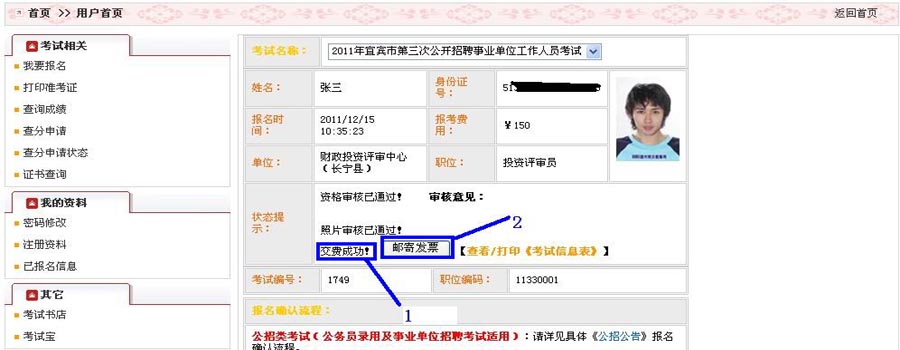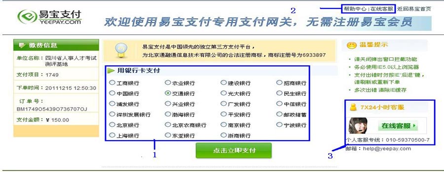 銀行提示支付成功后,請在再次登錄“我的后臺”查看報名信息,如狀態提示為:交費成功!則該此考試報名完成并成功。考生可在規定時間內上網進行準考證打印。若確認銀行已支付,但后臺未提示“交費成功”,請于第二天再行查詢,若還未提示,請查實銀行訂單號與考試中心聯系。