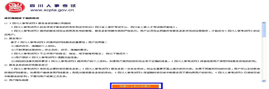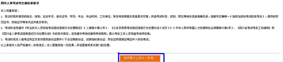 考試在閱讀完報名協議與四川人事考試考生誠信承諾書后,點擊“我同意以上協議(承諾)”方可進入下一步。