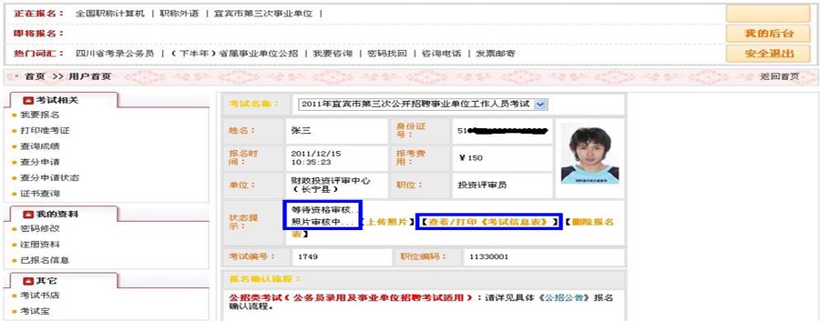 如上圖:查看"狀態提示",可以進行【上傳相片】、【查看/打印《考試信息表》】、【刪除報名表】操作。無異常請退出登錄,保證信息安全。