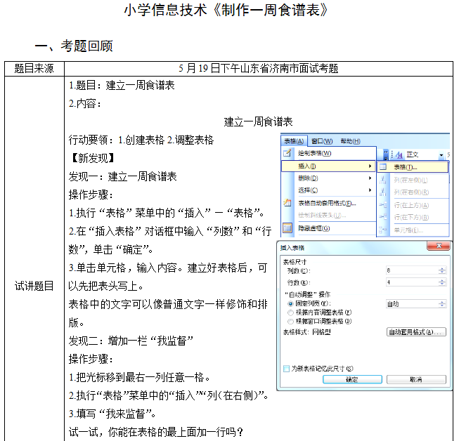 “表格”菜單中的“插入”——“表格”,在插入表格對話框中輸入“列數”和“行數”,單擊“確定”。教師在創建好的表格內輸入內容:早餐、午餐、晚餐。