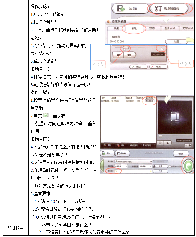 學生會給出答案。教師再次提問“如何將一段比賽的過程截取下來?”
