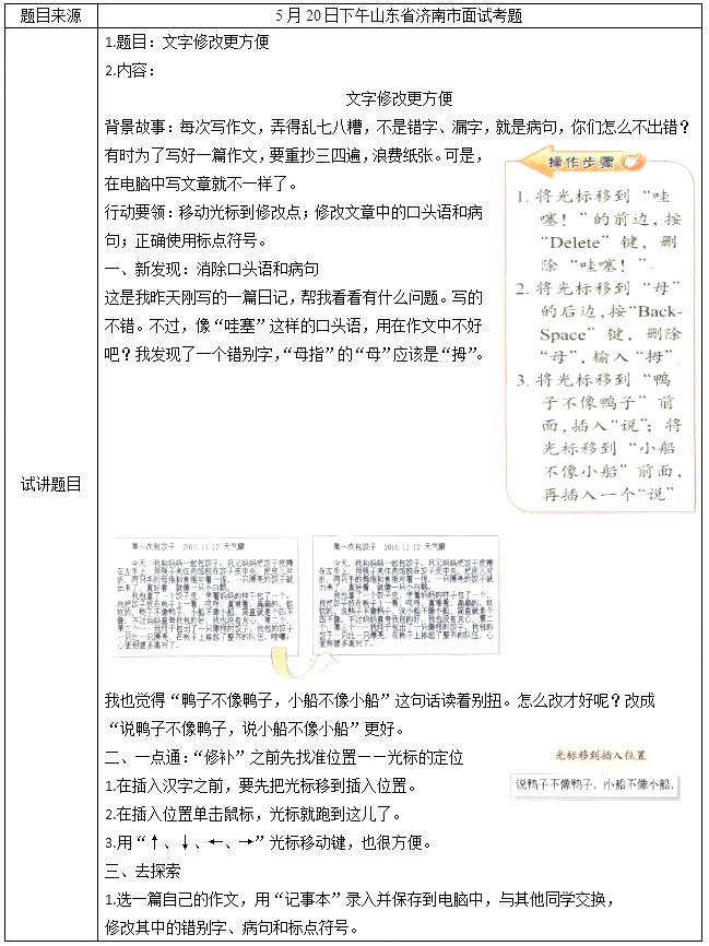 教師:“同學們,我們每次寫作文時,總會出現一些錯誤,將作文紙弄得亂七八糟,不是錯字、漏字,就是病句。有時為了寫好一篇作文,要重抄三四遍,浪費紙張??墒?,在電腦中寫文章就不一樣了,我們學習了在電腦中修改文字之后,就會發現修改是件很容易的事情,還能不留痕跡,今天我們就來學習如何修改文字”。