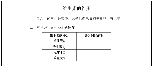老師總結:看來維生素還是對我們的人體有很大的作用的,我們這節課就一起來學習這節課的內容。(板書課題:維生素的作用)