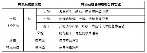教師請學生對照課本神經系統的組成和功能示意圖,相互說一說,并對大家提出的疑問做解答。先讓學生小組內討論,進行歸納,并用表格的形式展示出來,老師巡視、指導。